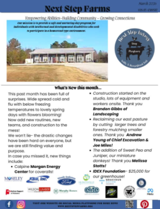 Next Step Farms is a 501(c)(3) non-profit organization providing day programs which teach important life skills to individuals with special needs, ages 18 and older. Our programs include everything from planting food and raising animals to mechanical skills, computers, basic finance and general life skills.